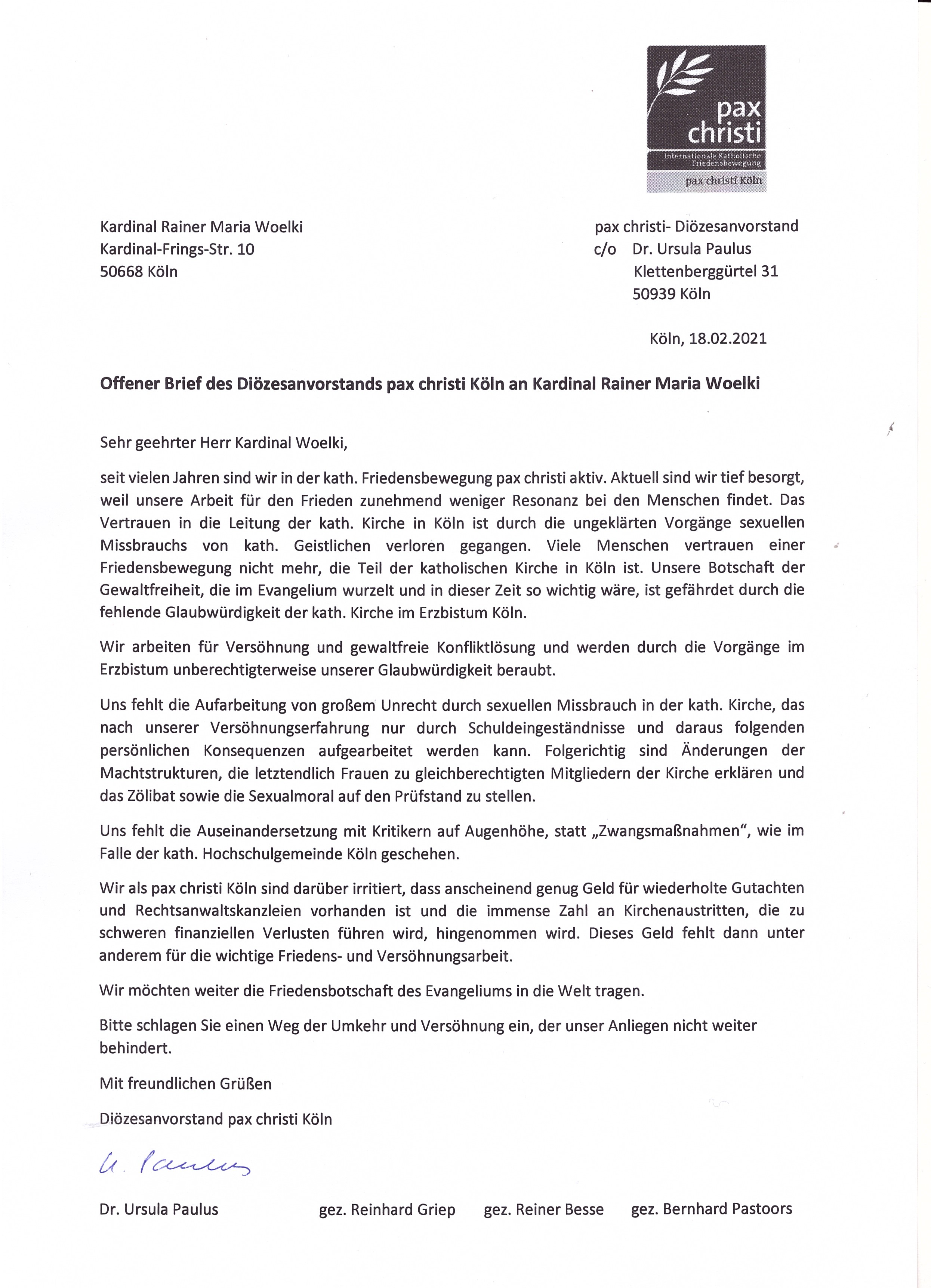 pax christi in der Diözese Köln bittet Kardinal Woelki den Weg der Umkehr und Versöhnung einzuschlagen, damit das Anliegen für den Frieden nicht weiter behindert wird.