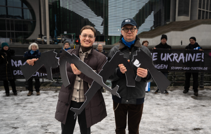 In Berlin wurde ein bildstarkes sieben Meter langes Banner von der Marschall-Brücke am Reichstagsufer gehangen unter dem Motto: „Nachhaltiger Frieden für die Ukraine! Deeskalation – Waffenstillstand – Verhandlungen.“ Damit haben wir ein Zeichen gesetzt für Diplomatie, Abrüstung und ein Ende des Blutvergießens. Zudem gab es im Anschluss eine Kundgebung bei der auch Jewgenij Arefiev und Andrii Konovalov, zwei Friedensaktivisten aus Russland und der Ukraine, sprachen. Die Aktion in Berlin wurde organisiert von: NaturFreunde Deutschlands, Deutsche Friedensgesellschaft – Vereinigte KriegsdienstgegnerInnen, Internationale der Kriegsdienstgegner*innen, Internationalen Ärzt*innen für die Verhütung des Atomkrieges/Ärzt*innen in sozialer Verantwortung (IPPNW), pax christi - Deutsche Sektion e.V.